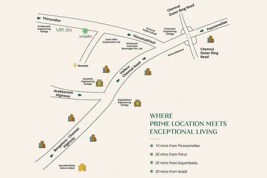 Located in the peaceful area of Nemam in Thirumazhisai, Vriddhi offers carefully planned plots ready for building. With carefully planned plots ready to build, offer various sizes to perfectly match your vision. Our prime location and attractive pricing make Vriddhi ideal for both commercial and residential developments. Each plot is thoughtfully planned to maximize value, making your investment both wise and rewarding.